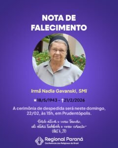 A Conferência dos Religiosos do Brasil – Regional Paraná (CRB-PR) manifesta seu mais profundo pesar e sua indignação diante do trágico falecimento da Irmã Nadia Gavanski, de 82 anos, ocorrido neste sábado, 21 de fevereiro, no município de Ivaí.